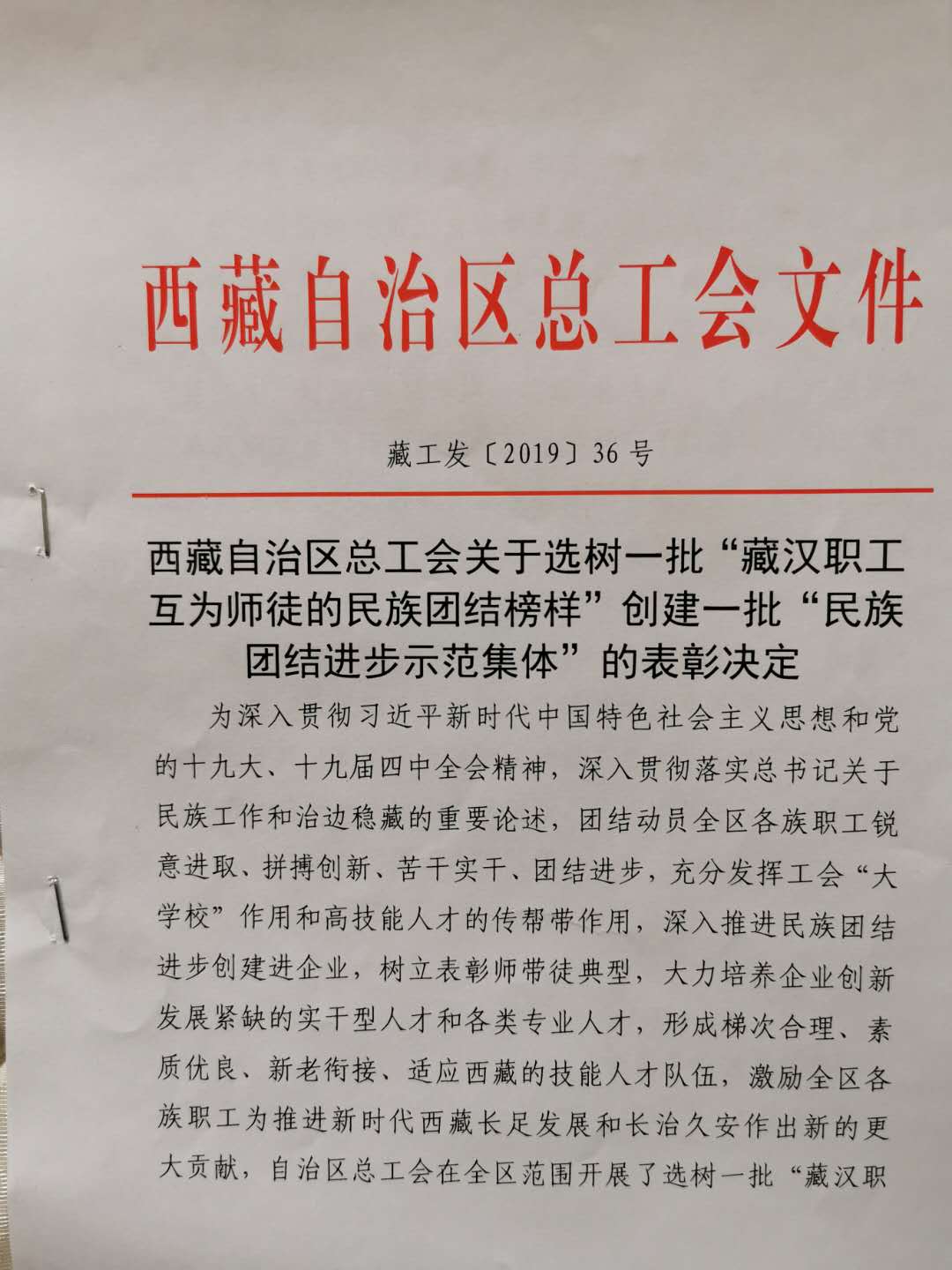 西藏自治區(qū)總工會關(guān)于選樹一批 "藏漢職工互為師徒的民族團(tuán)結(jié)榜樣 "創(chuàng)建一批 "民族團(tuán)結(jié)進(jìn)步示范集體 "的表彰決定