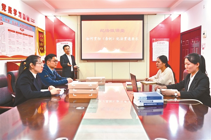 江西省新余市紀(jì)委監(jiān)委不斷強(qiáng)化紀(jì)檢監(jiān)察干部對(duì)執(zhí)紀(jì)執(zhí)法貫通理念的理解運(yùn)用,建立“通報(bào)講評(píng)”機(jī)制,針對(duì)實(shí)踐中發(fā)現(xiàn)的難點(diǎn)問題及時(shí)分析講解,提升案件辦理質(zhì)效。圖為該市紀(jì)委監(jiān)委案件審理室圍繞新修訂的紀(jì)律處分條例,解讀紀(jì)法銜接條款的理解運(yùn)用。黃磊 攝