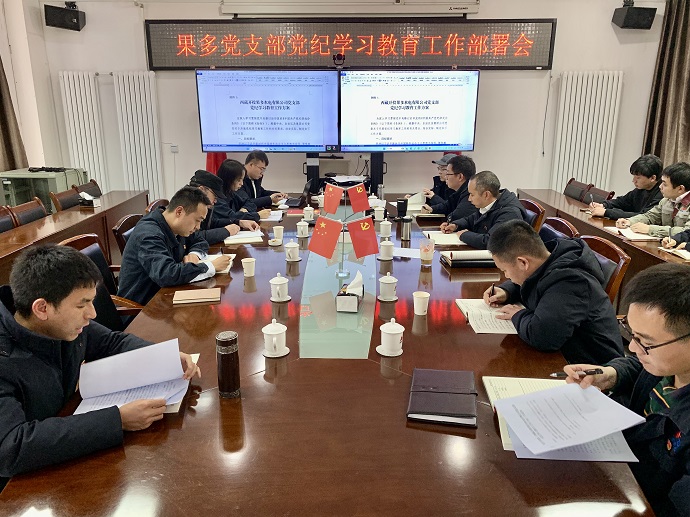 4月19日,果多水電公司黨支部召開黨紀學習教育工作部署會,傳達學習習近平總書記關于黨紀學習教育的重要講話、重要指示精神;蔡奇、李希4月3日在中央黨的建設工作領導小組第六次會議上的講話精神;王君正書記4月11日在主持召開自治區(qū)黨委常委會(擴大)會議上的講話精神;王君正書記4月15日在自治區(qū)黨委理論學習中心組黨紀學習教育讀書班上的講話精神;集團公司黨委黨紀學習教育安排部署會會議精神;宣讀果多水電公司黨支部黨紀學習教育工作方案,支部書記宋亞東對黨紀學習教育工作進行安排部署。