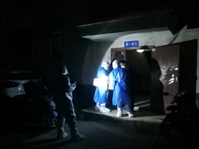 在做好防護(hù)準(zhǔn)備后,扯起嗓門開始耐心的給即將入睡的百姓做起動(dòng)員。在疫情期間,經(jīng)歷了漫長(zhǎng)的等待,蝸居在家的市民大多習(xí)慣了早晚無(wú)序的核酸檢測(cè),但還有不少以身體不適、經(jīng)不起“磨煉”等理由進(jìn)行躲避、抗拒,隊(duì)員們不厭其煩,只能冒著風(fēng)險(xiǎn)逐戶登門做思想工作。舉燈踱步、排門逐戶做完檢測(cè)一眨眼三個(gè)多小時(shí)過(guò)去了,再做好試管封裝,數(shù)據(jù)統(tǒng)計(jì)、校對(duì)后已至子夜后半段,深秋微涼的晚風(fēng)已被隊(duì)員的熱情牢牢抵御在防護(hù)服之外。
