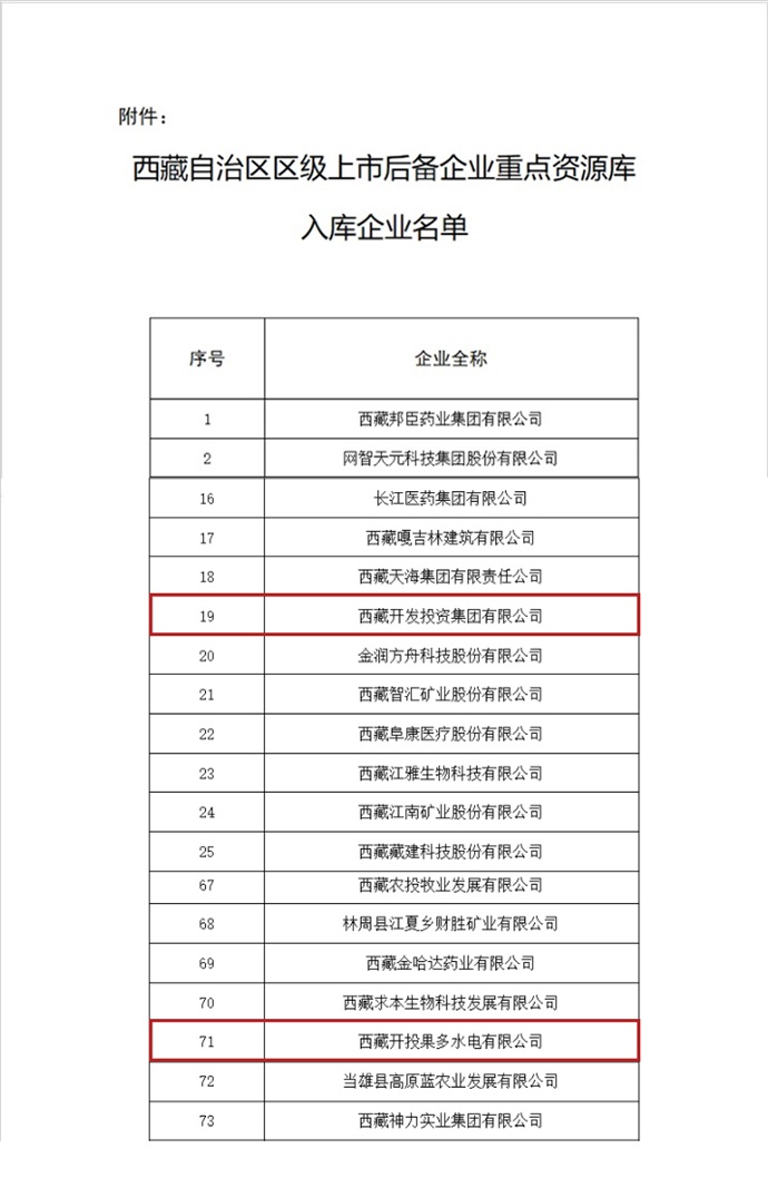 西藏開(kāi)發(fā)投資集團(tuán)和西藏開(kāi)投果多水電成功入選上市后備企業(yè)資源庫(kù)