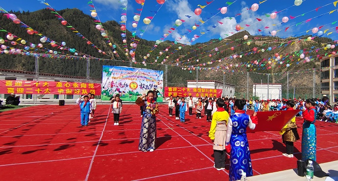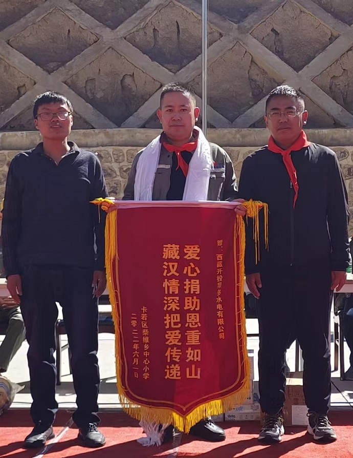 果多水電公司代表張二林同志作了題為“祖國的未來,民族的希望”的講話,并代表果多水電公司給學校捐贈了學習用品,足球、排球、羽毛球等,勉勵孩子們要樹立遠大理想,努力學習,健康成長,以優(yōu)異的成績回報社會、回報祖國。柴維鄉(xiāng)小學贈送了“愛心捐助恩重如山,藏漢情深把愛傳遞”的錦旗,感謝果多水電公司對學校的關(guān)心支持幫助。