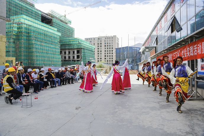 在能源基地項目現(xiàn)場,青春洋溢的大學(xué)生隊員們以特色舞蹈展現(xiàn)了西藏地方文化。西藏大學(xué)帶隊老師向工人代表贈送了應(yīng)急處置知識包,并向參建工人普及日常應(yīng)急知識。隨后,師生們在集團公司安全監(jiān)管人員的帶領(lǐng)下,參觀了能源基地項目。