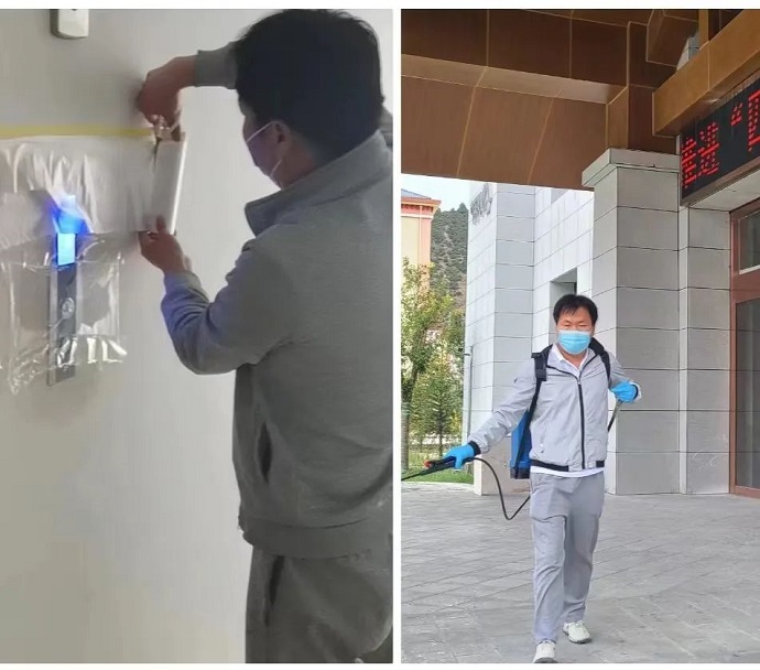 此次疫情發(fā)展伊始,酒店周邊已多處發(fā)生感染病例,距最近的高風險區(qū)域不到100米。孫海崗帶領(lǐng)部門人員,沖在“疫”線,堅持每天對酒店各個區(qū)域進行2次消殺,不留死角。由于酒店占地面積大,單體建筑分布較廣,完成一次全面徹底消殺用時需要2小時以上。孫海崗深知消殺工作的重要性,在工作過程中任勞任怨,埋頭苦干。