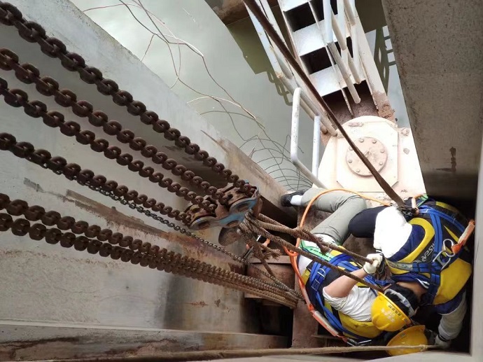 9月5日11時30分,果多水電站上游來水量突增,水庫攔污漂變浮箱無法及時上浮,導(dǎo)致大量垃圾飄進(jìn)進(jìn)水口區(qū)域,給機(jī)組運(yùn)行造成一定的安全隱患。吉克爾博接到部門安排后,馬上帶領(lǐng)兩名青年員工到浮箱上利用千斤頂、手動葫蘆等工具開展處理。經(jīng)過分析、討論,判定攔污漂卡澀的原因?yàn)閷?dǎo)向輪長期受力不均發(fā)生變形,利用千斤頂反向作用力和手拉葫蘆的牽引力,最終將攔污漂卡澀問題解決。