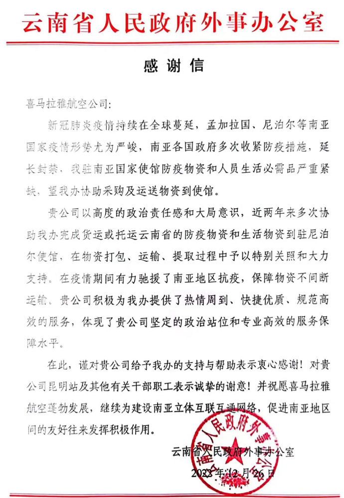 云南省人民政府外事辦向喜馬拉雅航空公司發(fā)來感謝信