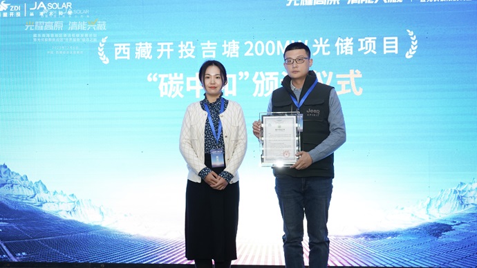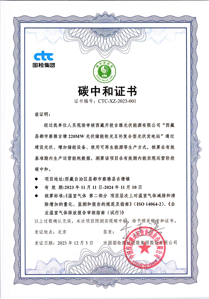 CTC國(guó)檢為吉塘200MW項(xiàng)目頒發(fā) “碳中和”證書