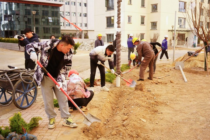 活動(dòng)現(xiàn)場,大家一起搬樹苗、揮鍬鏟土、扶樹填坑、踏土夯苗、灌溉澆水,全身心地投入到植樹過程中,每個(gè)環(huán)節(jié)都井井有條,呈現(xiàn)出一派干勁十足、熱火朝天的景象。在大家的努力下,一排排新栽的樹苗挺立在春風(fēng)中,為能源基地增添了一抹清新的綠色。