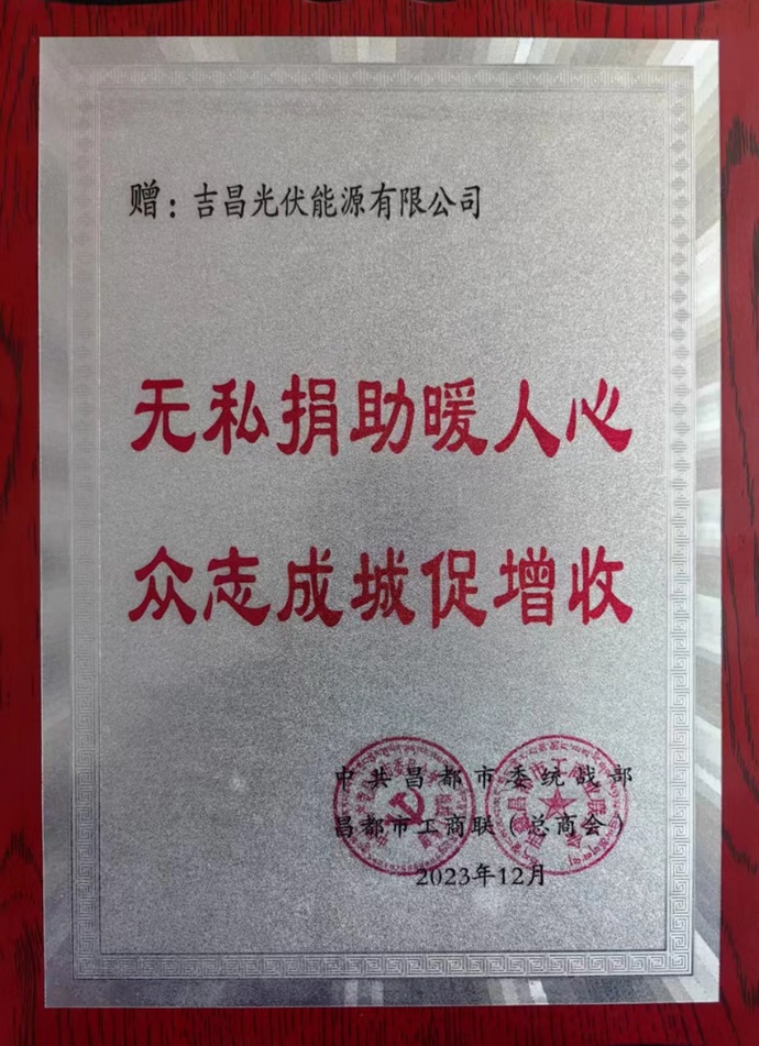 4月26日,中共昌都市委統(tǒng)戰(zhàn)部、昌都市工商聯(lián)(總商會)聯(lián)合授予西藏開投吉昌光伏能源有限公司“無私捐助暖人心 眾志成城促增收”榮譽獎牌,對公司充分發(fā)揮典型示范帶動效應(yīng),有效增強“萬企興萬村”促增收、“百企幫百戶”等活動影響力和凝聚力,為昌都市鄉(xiāng)村振興貢獻企業(yè)力量予以肯定和鼓勵。