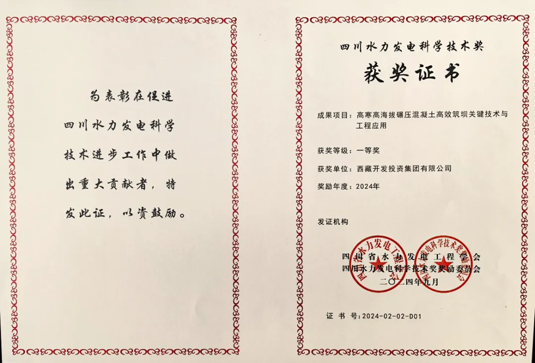 9月25日,四川省水力發(fā)電工程學(xué)會2024年度學(xué)術(shù)年會在成都召開,并舉辦2024年四川水力發(fā)電科學(xué)技術(shù)獎(jiǎng)?lì)C獎(jiǎng)典禮,西藏開投集團(tuán)果多水電站創(chuàng)新成果“高寒高海拔碾壓混凝土高效筑壩關(guān)鍵技術(shù)與工程應(yīng)用”榮獲四川水力發(fā)電科學(xué)技術(shù)獎(jiǎng)一等獎(jiǎng)。