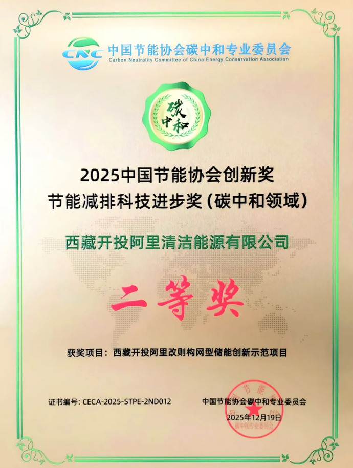 近日,由中國(guó)質(zhì)量認(rèn)證中心、中國(guó)節(jié)能協(xié)會(huì)碳中和專業(yè)委員會(huì)聯(lián)合頒發(fā)的2025中國(guó)節(jié)能協(xié)會(huì)創(chuàng)新獎(jiǎng)名單揭曉,由西藏開投阿里清潔能源公司投資建設(shè)的阿里改則構(gòu)網(wǎng)型儲(chǔ)能創(chuàng)新示范項(xiàng)目獲“節(jié)能減排科技進(jìn)步獎(jiǎng)(碳中和領(lǐng)域)二等獎(jiǎng)”。