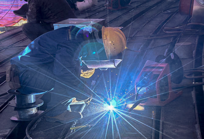 現(xiàn)場工人進(jìn)行金屬板材接縫處理。