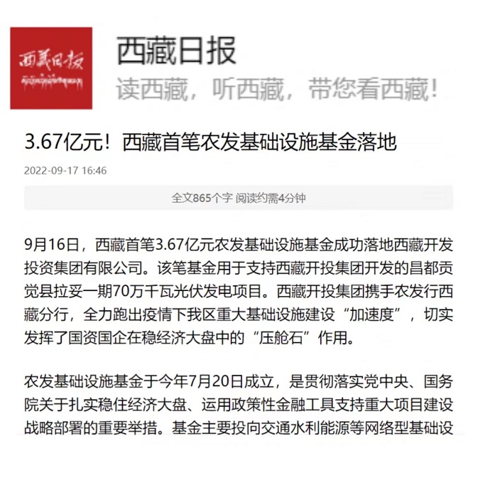 ?。ň幷甙矗段鞑厝請蟆?022年9月17日報道西藏首筆農(nóng)發(fā)基礎(chǔ)設(shè)施基金落地西藏開投集團。全文如下: