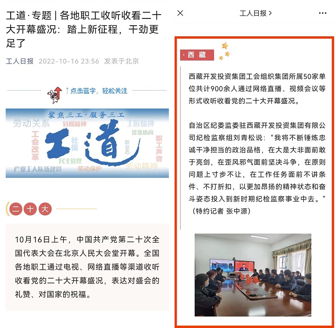 (編者按)《工人日?qǐng)?bào)》2022年10月16日?qǐng)?bào)道《各地職工收聽(tīng)收看二十大開(kāi)幕盛況:踏上新征程,干勁更足了》專題報(bào)道,文章引用部分集團(tuán)公司新聞信息。