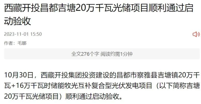 人民網(wǎng)、中國(guó)西藏新聞網(wǎng)、西藏日?qǐng)?bào)客戶端報(bào)道了《西藏開(kāi)投昌都吉塘20萬(wàn)千瓦光儲(chǔ)項(xiàng)目順利通過(guò)啟動(dòng)驗(yàn)收》