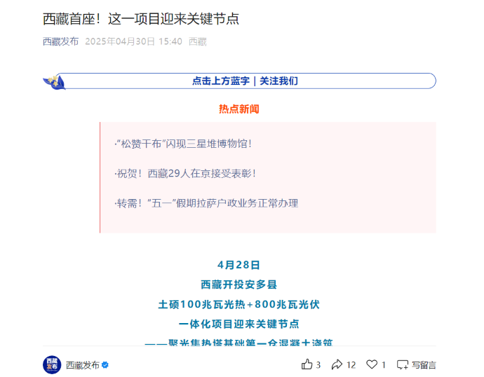 近日,西藏首個光熱示范工程——西藏開投安多土碩光熱一體化項(xiàng)目建設(shè)迎來關(guān)鍵節(jié)點(diǎn)的消息,被中國發(fā)展網(wǎng)、西藏日報、西藏發(fā)布等各級媒體平臺宣傳報道,提升了集團(tuán)品牌影響力和產(chǎn)業(yè)發(fā)展的傳播力。
