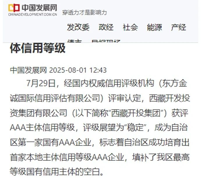 近期,中國發(fā)展網(wǎng)、西藏日報客戶端、西藏商報等媒體聚焦報道西藏開發(fā)投資集團有限公司獲評AAA主體信用等級消息。7月29日,經(jīng)國內權威信用評級機構(東方金誠國際信用評估有限公司)評審認定,西藏開發(fā)投資集團有限公司獲評AAA主體信用等級,評級展望為“穩(wěn)定”,成為自治區(qū)第一家國有AAA企業(yè),標志著自治區(qū)成功培育出首家本地主體信用等級AAA企業(yè),填補了我區(qū)最高等級國有信用主體的空白。