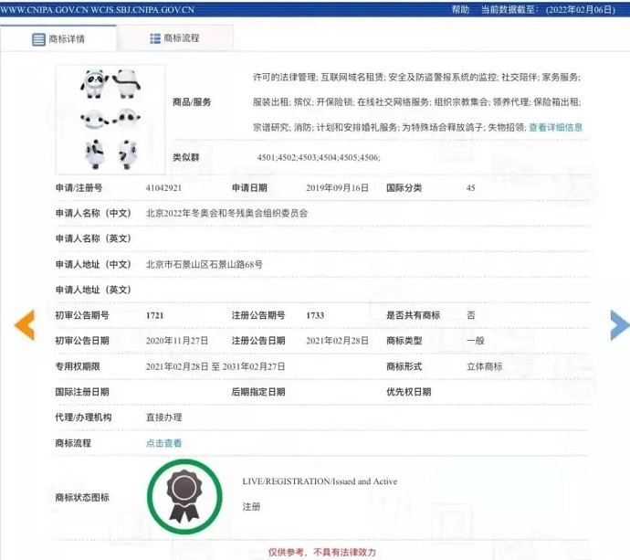 北京冬奧就中英文名稱“冰墩墩”“Bing Dwen Dwen”及其三維標(biāo)志在全部45個(gè)類別的商標(biāo)于2020年獲準(zhǔn)注冊。