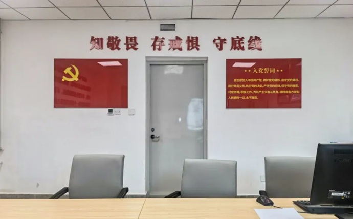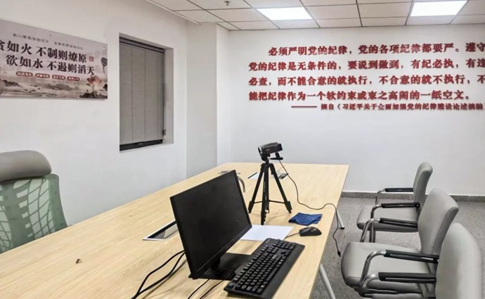 “初心談話室”位于集團9樓紀(jì)律檢查部。墻體設(shè)置有黨旗、入黨誓詞,以及習(xí)近平總書記關(guān)于加強黨的紀(jì)律建設(shè)重要論述摘編等內(nèi)容。室內(nèi)還配有專用辦公電腦、打印機、光盤刻錄機等設(shè)施設(shè)備,實行全封閉管理,嚴(yán)格執(zhí)行使用登記制度。