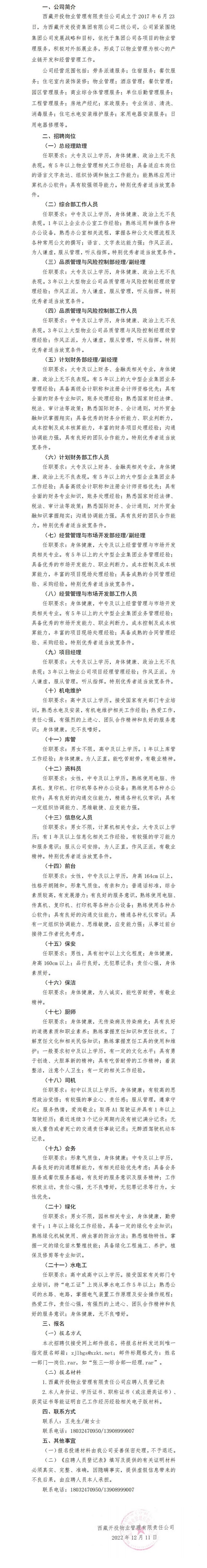 西藏開投物業(yè)管理有限責(zé)任公司招聘公告