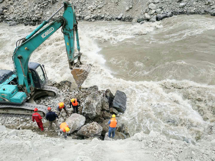 7月4日受持續(xù)強降雨影響,易貢藏布河水暴漲,7月5日凌晨5時,金橋水電站壩前水位達(dá)到3412.86米,施工區(qū)水流量達(dá)到647 m3/s。24小時后,壩前水位3412.03米,已建成的右岸壩段及在建的左岸壩段因為質(zhì)量把控到位、施工組織及防洪措施到位,經(jīng)受住了洪水的考驗;但是從嘉黎縣至金橋水電站施工現(xiàn)場的100公里公路有19處路段出現(xiàn)不同程度損毀,其中3處路段完全中斷,沖毀路段約5公里,路基、堡坎垮塌約2公里,金橋水電站主要建材物資暫時停運,尼屋鄉(xiāng)2000余村民出行受阻,存在極大安全隱患,嚴(yán)重影響了受災(zāi)群眾的生產(chǎn)生活。