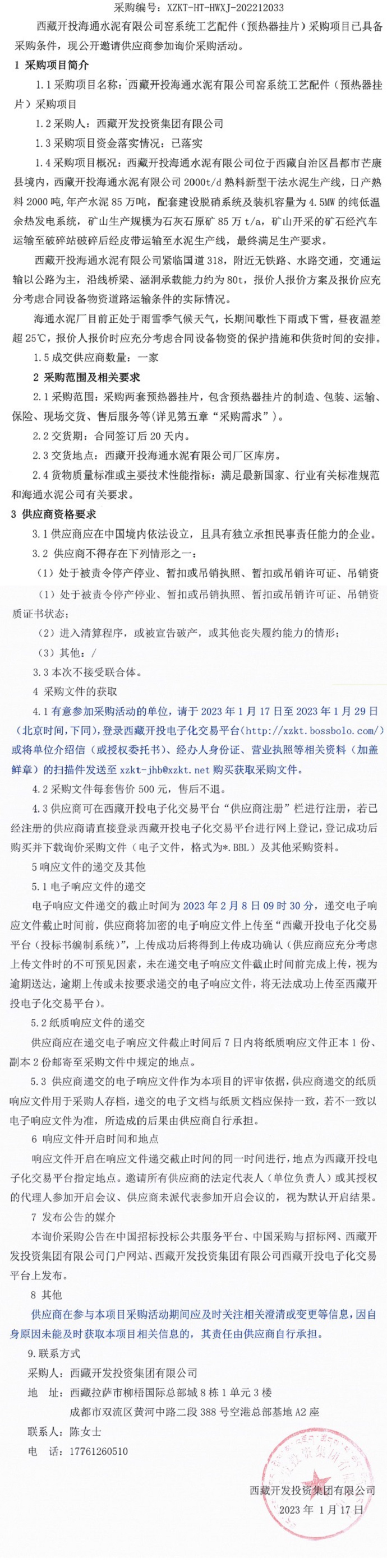 西藏開(kāi)投海通水泥有限公司窯系統(tǒng)工藝配件(預(yù)熱器掛片)采購(gòu)項(xiàng)目詢(xún)價(jià)采購(gòu)公告
