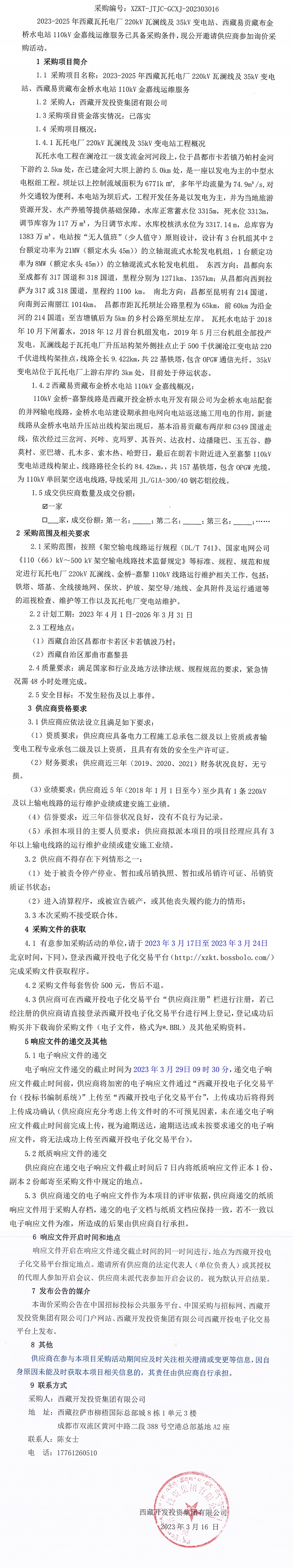 2023-2025年西藏瓦托電廠220kV 瓦瀾線及35kV變電站、西藏易貢藏布金橋水電站 110kV金嘉線運(yùn)維服務(wù)詢價(jià)采購公告