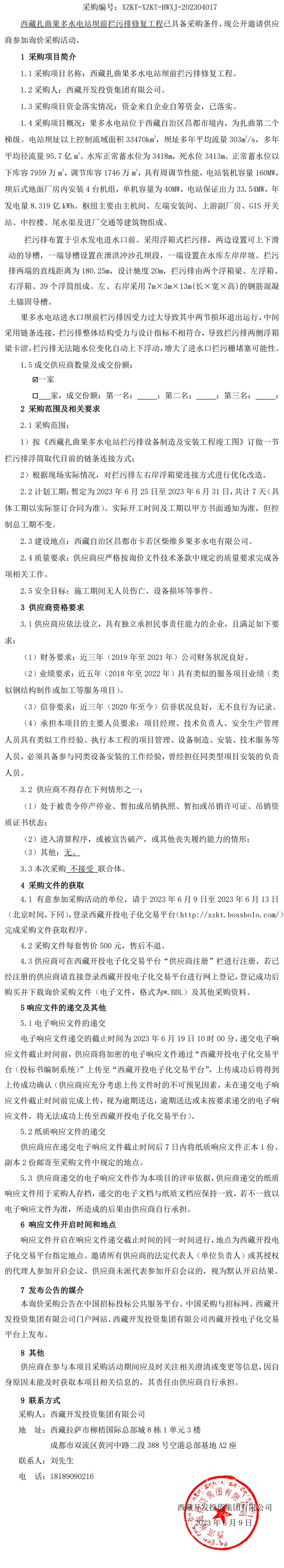 西藏扎曲果多水電站壩前攔污排修復(fù)工程詢價(jià)采購(gòu)公告