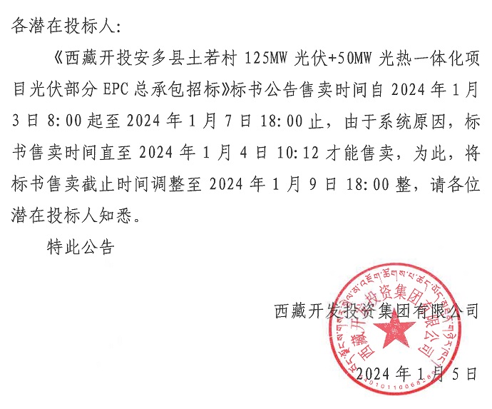 關(guān)于延長(zhǎng)《西藏開投安多縣土若村125MW光伏+50MW光熱一體化項(xiàng)目光伏部分EPC總承包招標(biāo)》標(biāo)書售賣時(shí)間的公告