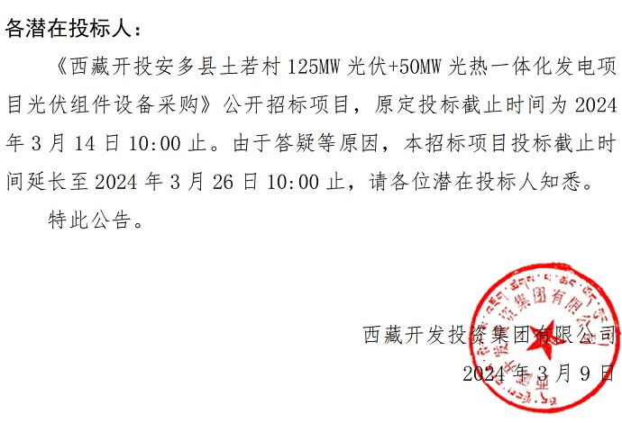 一體化發(fā)電項目光伏組件設備采購》投標截止時間的公告