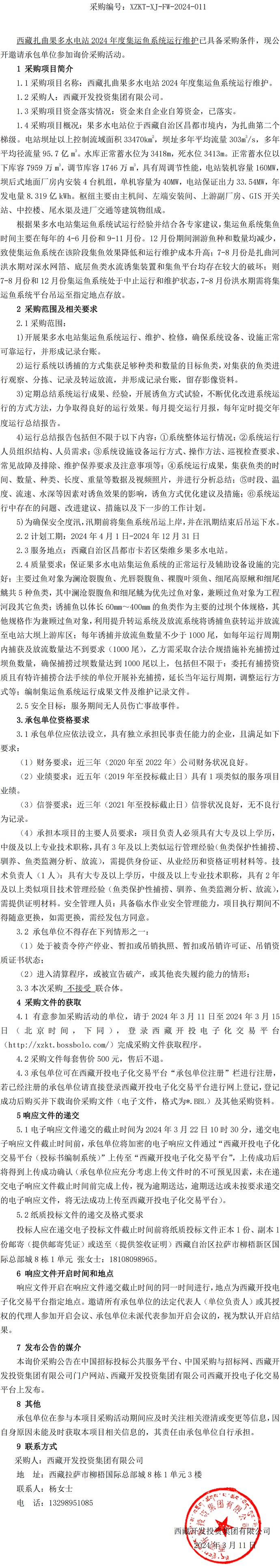 西藏扎曲果多水電站 2024 年度集運魚系統(tǒng)運行維護詢價采購公告