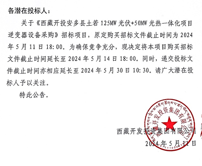 關(guān)于延長《西藏開投安多縣土若125MW光伏+50MW 光熱一體化項目逆變器設(shè)備采購招標(biāo)》購買招標(biāo)文件截止時間的公告
