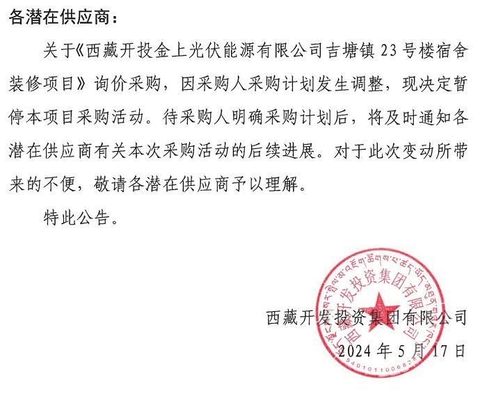 關(guān)于暫停《西藏開投金上光伏能源有限公司吉唐鎮(zhèn)23號樓宿舍裝修項目》詢價采購活動的公告
