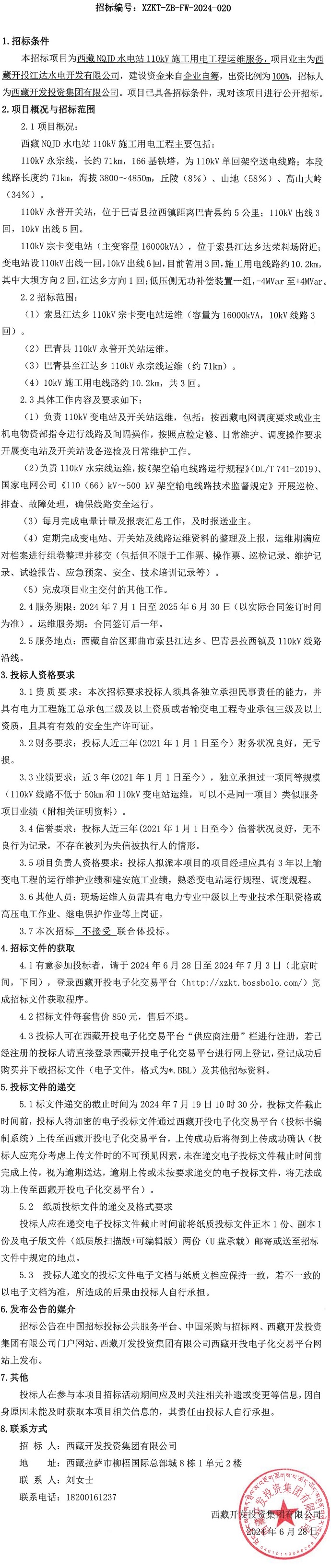 西藏NQJD水電站110kV施工用電工程運維服務(wù)招標公告