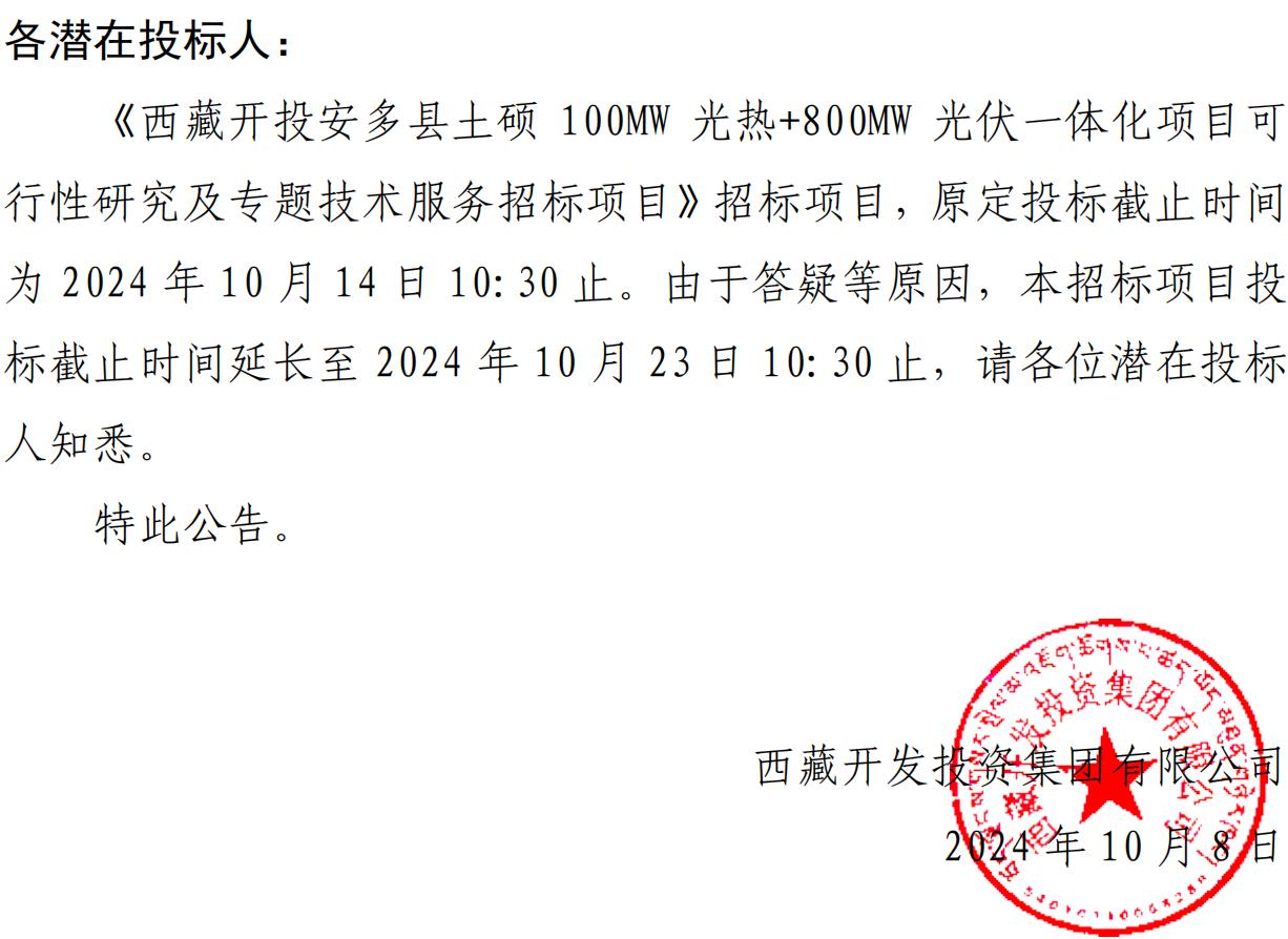 關(guān)于延長(zhǎng)《西藏開投安多縣土碩 100MW光熱+800MW 光伏一體化項(xiàng)目可行性研究及專題技術(shù)服務(wù)招標(biāo)項(xiàng)目》投標(biāo)截止時(shí)間的公告