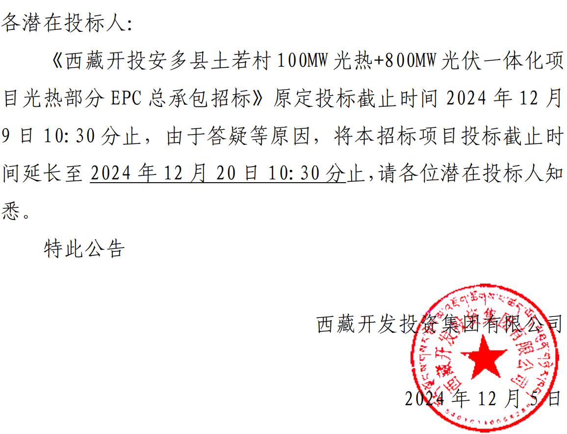 關于延長《西藏開投安多縣土碩 100MW 光熱+800MW 光伏一體化項目光熱部分 EPC 總承包招標》投標截止時間的公告