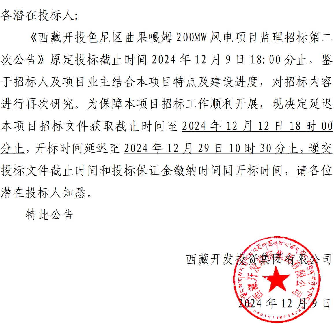 關(guān)于延長(zhǎng)《西藏開投色尼區(qū)曲果嘎姆200MW風(fēng)電項(xiàng)目監(jiān)理招標(biāo)第二次公告》投標(biāo)截止時(shí)間的公告