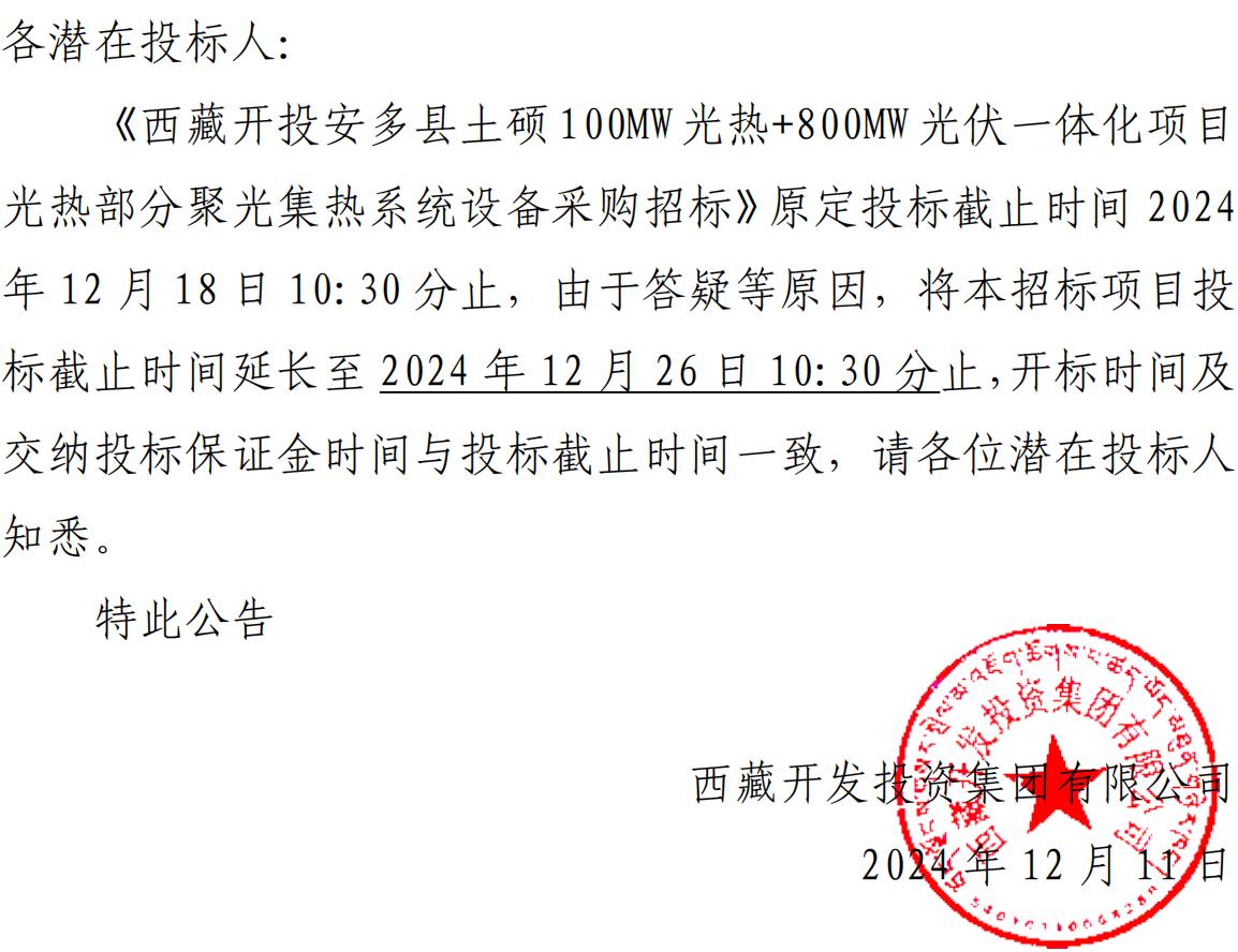 關于延長《西藏開投安多縣土碩100MW光熱+800MW光伏一體化項目光熱部分聚光集熱系統(tǒng)設備采購招標》投標截止時間的公告
