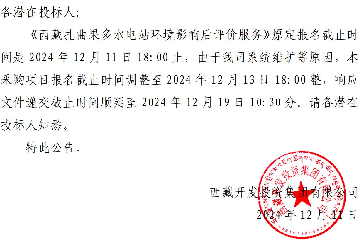 關(guān)于延長(zhǎng)《西藏扎曲果多水電站環(huán)境影響后評(píng)價(jià)服務(wù)》詢(xún)價(jià)報(bào)名截止時(shí)間的公告