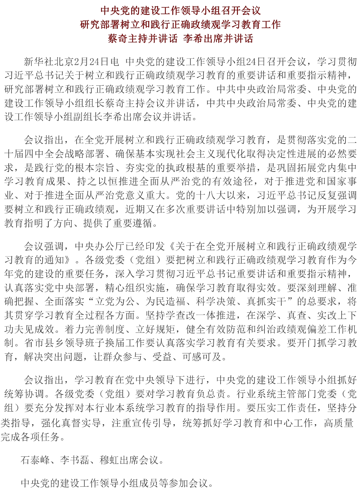 中央黨的建設(shè)工作領(lǐng)導(dǎo)小組召開(kāi)會(huì)議研究部署樹(shù)立和踐行正確政績(jī)觀(guān)學(xué)習(xí)教育工作