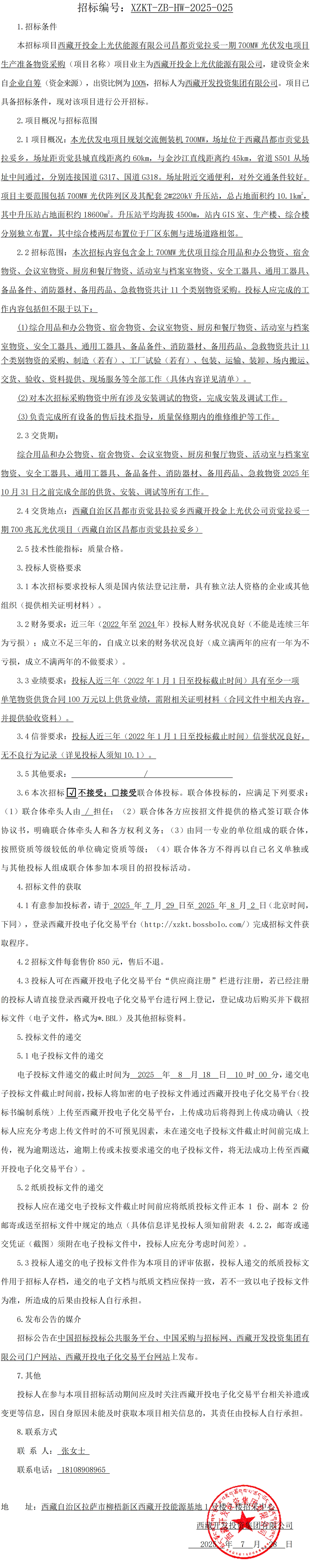 西藏開投金上光伏能源有限公司昌都貢覺拉妥一期700MW光伏發(fā)電項目生產(chǎn)準備物資采購招標公告